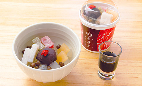 Anmitsu is traditional Japanese confectionery made of agar jelly topped with homemade sweet bean paste and soft rice cake (gyuhi).*1 Funabashiya’s agar jelly is made by the traditional method of boiling and solidifying agar. The sweet bean paste is made daily by our specialized chefs. Funabashiya’s anmitsu is a one-of-a-kind treat that contains its kuzumochi (fermented wheat starch cake). Depending on the season, limited-edition anmitsu with agar jelly and sweet bean paste in other flavors are also available.