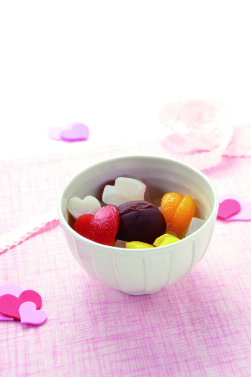 チョコレート餡にハート型の苺寒天とくず餅を添えたバレンタイン時期限定のあんみつです。