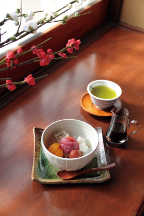 ・販売期間:2026年2月2日(月)~2026年3月8日(日) ・670円(税込) ・販売店舗:亀戸天神前本店・東京スカイツリータウン・ソラマチ店・シャポー小岩・シャポー船橋店・テルミナ錦糸町店・アトレ亀戸店・シャポー市川・カメイドクロック店・JR錦糸町北口店 梅じそ餡に花型のくず餅、梅のシロップ漬を添えた季節限定のあんみつです。 黒蜜をかけてお召しあがりください。