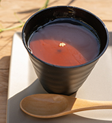 香ばしいほうじ茶のブランマンジェに、つるんとしたほうじ茶ゼリーと水まんじゅうを重ねました。味わいと食感の変化が楽しい一品です。