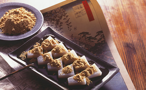 船橋屋初代の出身地である下総国(千葉県北部)船橋は、当時、良質な小麦の産地でした。初代は亀戸天神が梅や藤の季節に、参拝客で賑わうのを見て上京し、湯で練った小麦澱粉をせいろで蒸し、黒蜜と黄な粉をかけて餅を作り上げました。